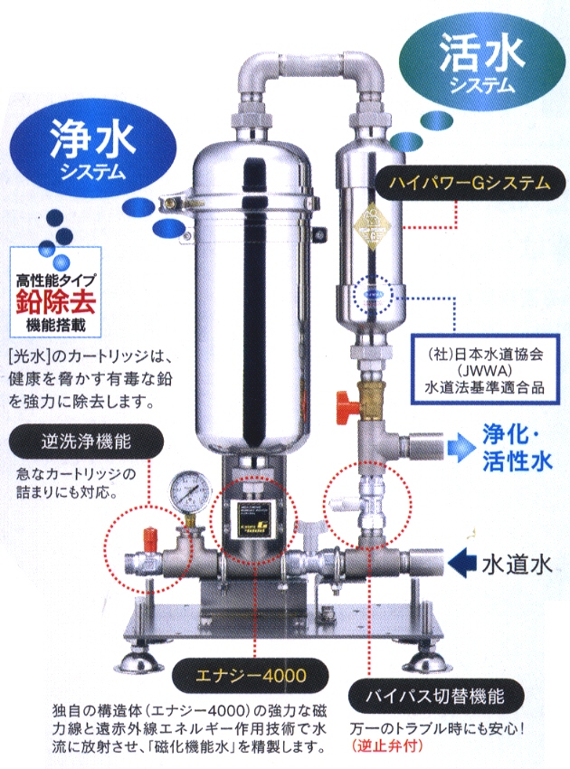 | | 一台で家中の水道水をすべて浄化・活水化するシステム。供給できる水量が豊富なので、一般の浄水器や市販のボトルウォーターと比較すると経済的といえます。蛇口ごと取りつける必要がないため、水まわりがすっきりと広くつかえます。 |