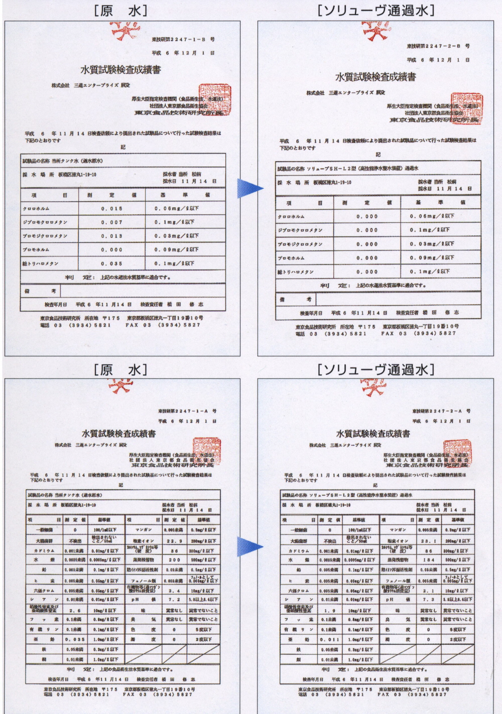 | ソリューヴ本体・工事費の償却期間を5年間とすると、ソリューヴのコストは、1リットル当たりおおよそ0.5円。(※1)1人1日当たり生活用水使用量を323リットルとすると1日わずか161.5円です。2リットルで150円する市販のミネラルウォーターと比較すると、差は歴然です。しかも、フィルターの総処理量は約20万リットルもありますから、ほかの浄水器と比較しても、結局お得です。(※1 2001年版水質源白書 国土交通省) |