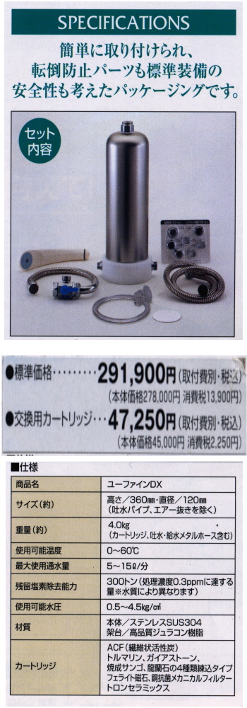| 【ユーファインDX】のカートリッジは、ペットボトル(1.5リットル)20万本分に相当する30万リットルの処理能力を誇りますので、長く使用でき経済的です。※水質や通水量によっては異なります。 | |