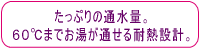 | 【ユーファインDX】の通水量は、1分あたり5〜15リットルのたっぷりタイプ。だから浴槽への給水も時間がかからずスムーズに。もちろん耐熱設計も充分に施してありますので、60℃までのお湯をたっぷりとお使いできます。 | |
