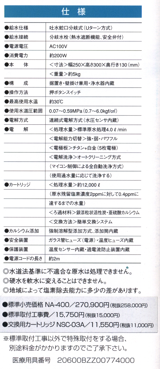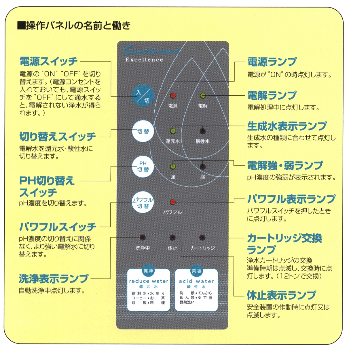 エクセリーナ エクセレンスは水道水を濾過して作った浄水を、 さらに電気分解して還元水と酸性水を作るシステムです。 豊富なミネラル分は残しながら、pH(酸性度・アルカリ度を示す数値)、 ORP(酸化還元電位)を調節することで、水道水から美味しい水、 健康や美容に良い水を生成します。 |