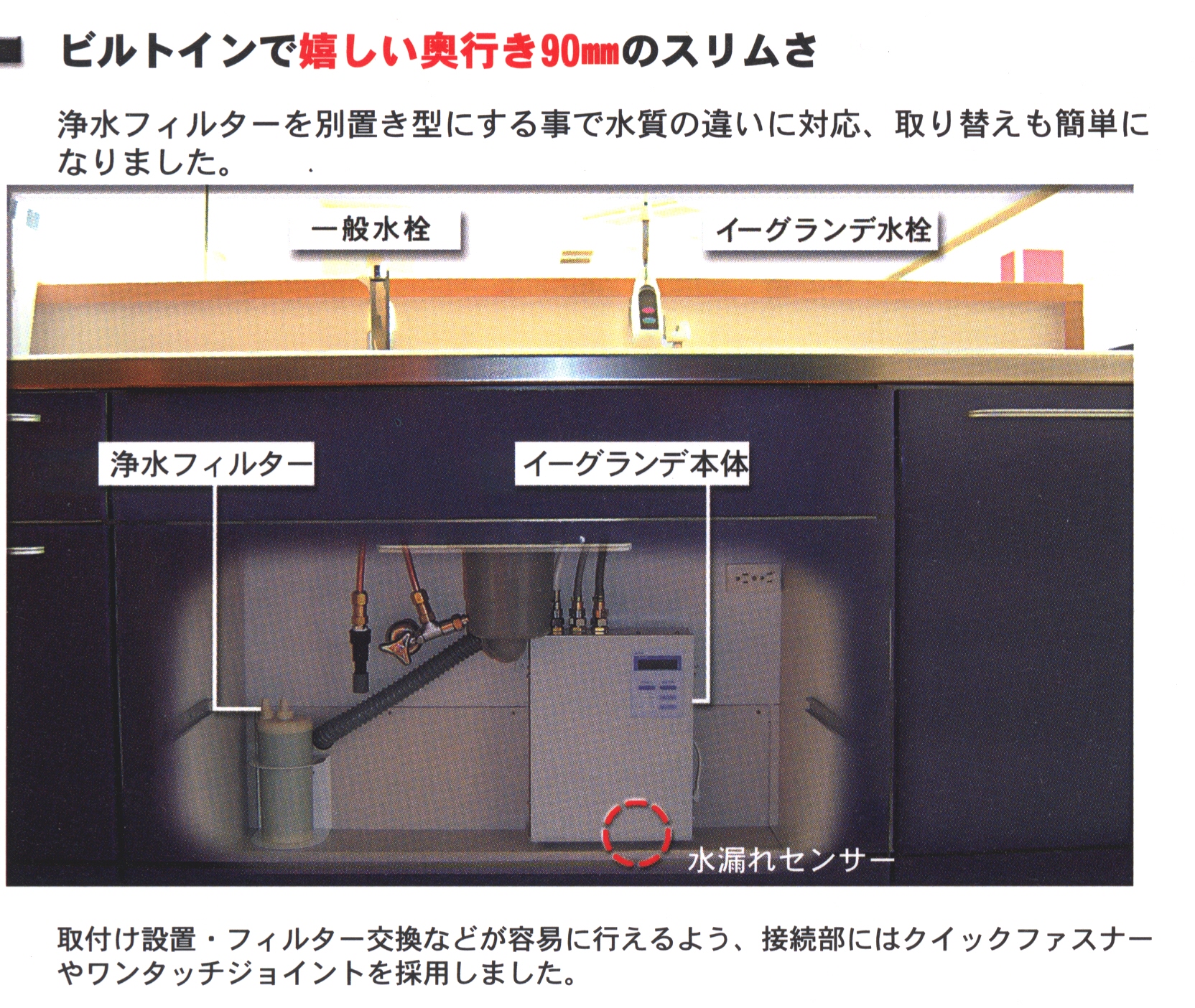 ビルトインで嬉しい奥行き90oのスリムさ | | 大型電解槽で実現、イオン水パワー |