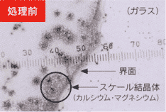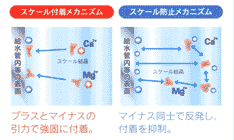界面はマイナスに帯電する表面電位を有しているため、+に帯電しているスケール結晶体(カルシウム、マグネシウム)が電気的引力作用により界面に付着している状態です。