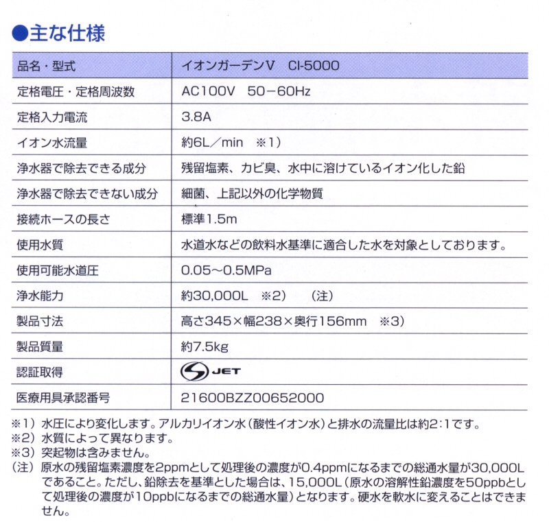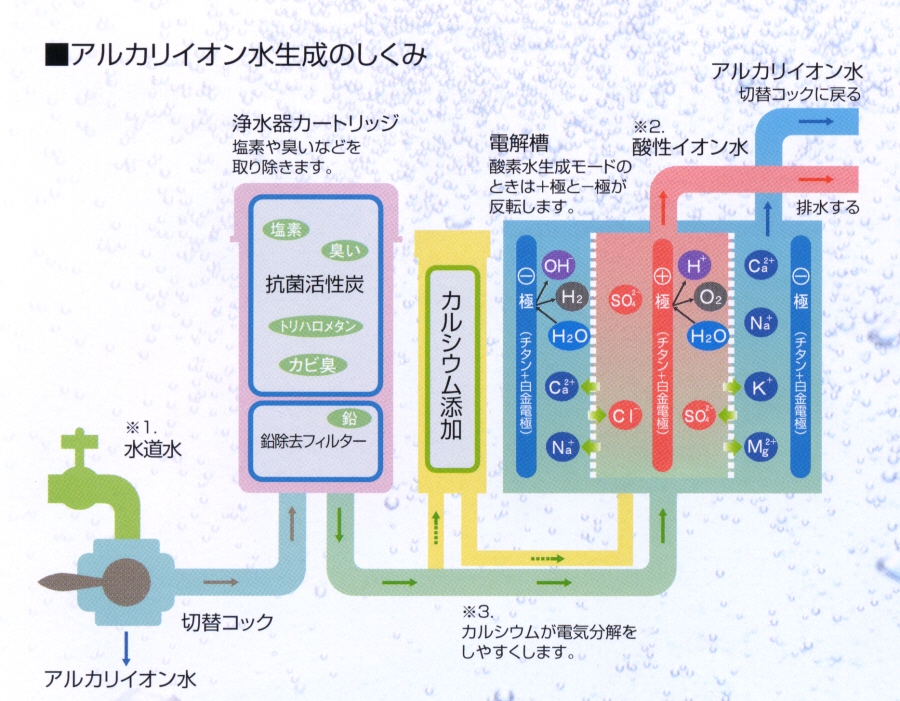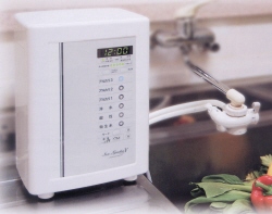 蛇口に切替コックを取りつけ、ホースで接続するだけで水道直結タイプ。生成されたイオンが蛇口に戻るリターン方式だから、流し台の側に置き場所が無くても大丈夫。 |