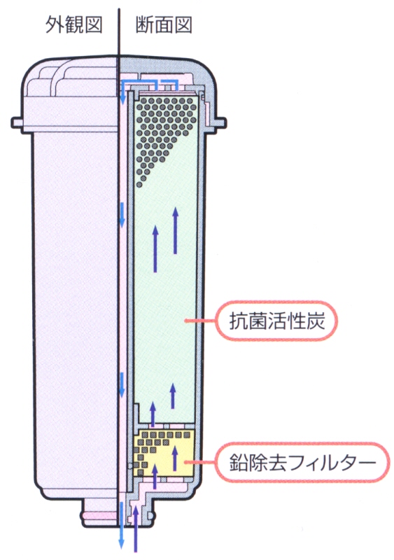 除菌活性炭+鉛除去フィルタータイプ浄水カートリッジを標準装備で見えないけど気になる鉛をシッカリ除去。抗菌活性炭が水道水のカルキ臭、カビ臭などを取り除き、美味しい水をつくります。また、高性能重金属フィルターがイオン化した鉛を強力に除去します。