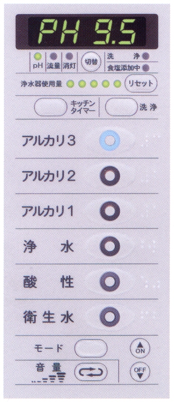 アルカリ、酸性、浄水、衛生水の水質選択スイッチの近傍に水質の種類を点字で表示。視覚に障害のある方の使用も考慮しています。 |