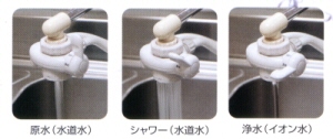 蛇口に取りつける切替コックは、原水(水道水)・シャワー(水道水)・浄水(イオン水)と3つの水を手元でカンタンに切替ok。