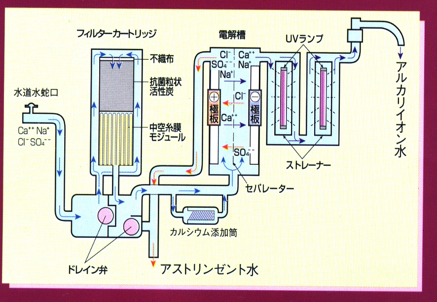 アルカリイオン整水器とは、水を浄化する機能に加え水の成分を電気分解によって整え、飲用として胃腸の働きを助けるアルカリイオン水と酸性のアストリンゼント水を生成する機器のことです。