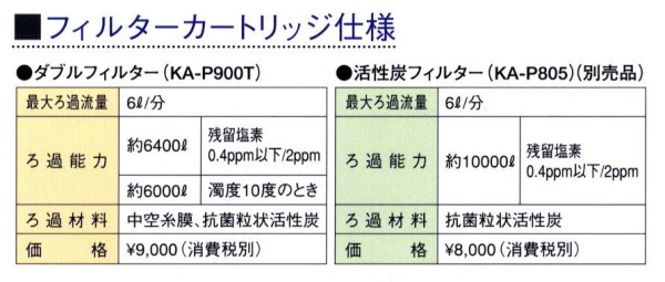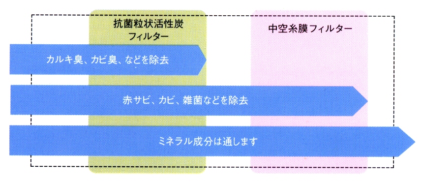 | 雑菌や赤サビ、濁りなど不純物を取り除く中空糸膜にカルキ臭やカビ臭などいやな臭いをしっかり吸着する抗菌粒状活性炭を組み合わせた〈ダブルフィルター〉と抗菌粒状活性炭のみ〈抗菌粒状活性炭フィルター〉(別売)のどちらでも、使用することができます。水質に併せてお好みのフィルターを選んでください。 |  |