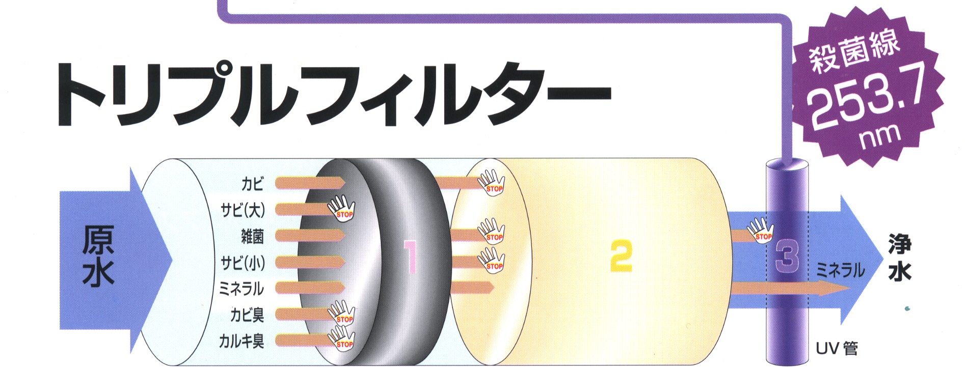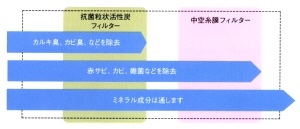 | まず、活性炭でカルキ臭、カビ臭、金属臭等、嫌な臭いを除去。ミネラル分はそのまま通過するので、水のおいしさが保たれます。 | 次に、中空糸膜で赤サビ、濁り、カビなどを除去します。やはりミネラル分はそのまま通過するので水の美味しさが保たれます。もともとは病院の手術用無殺菌水を作るために開発された物で、様々な分野で活躍しています。 | 更に、UV(紫外線)を一定照射する事で『無菌水』の生成を可能にしました。アルカリイオン整水器としてはミネトップUVが初めて搭載した新機能です。水質が変化する事もなく、生成水の質の向上を実現しました。 |